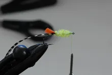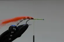 After a coffee break I followed this miraculous inspiration out of nowhere and found two unbelievable ugly flies - bright green body, orange tail and a grizzly-hackle tied around the body.
