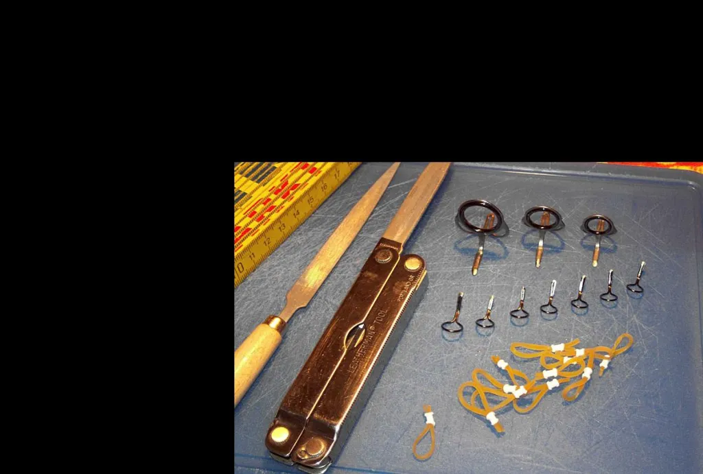 Measuring device, different files, strippers and running guides and rubber band straps for placing the guides temporarily on the blank.